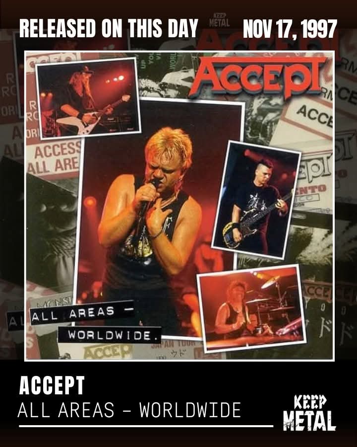 🎤 On November 17, 1997, German heavy metal veterans ACCEPT delivered their third live album, All Areas – Worldwide. Spanning two discs, the record captured the band’s formidable stage presence and the enduring power of their catalog across various global stops, primarily documenting their mid-1990s reunion era.