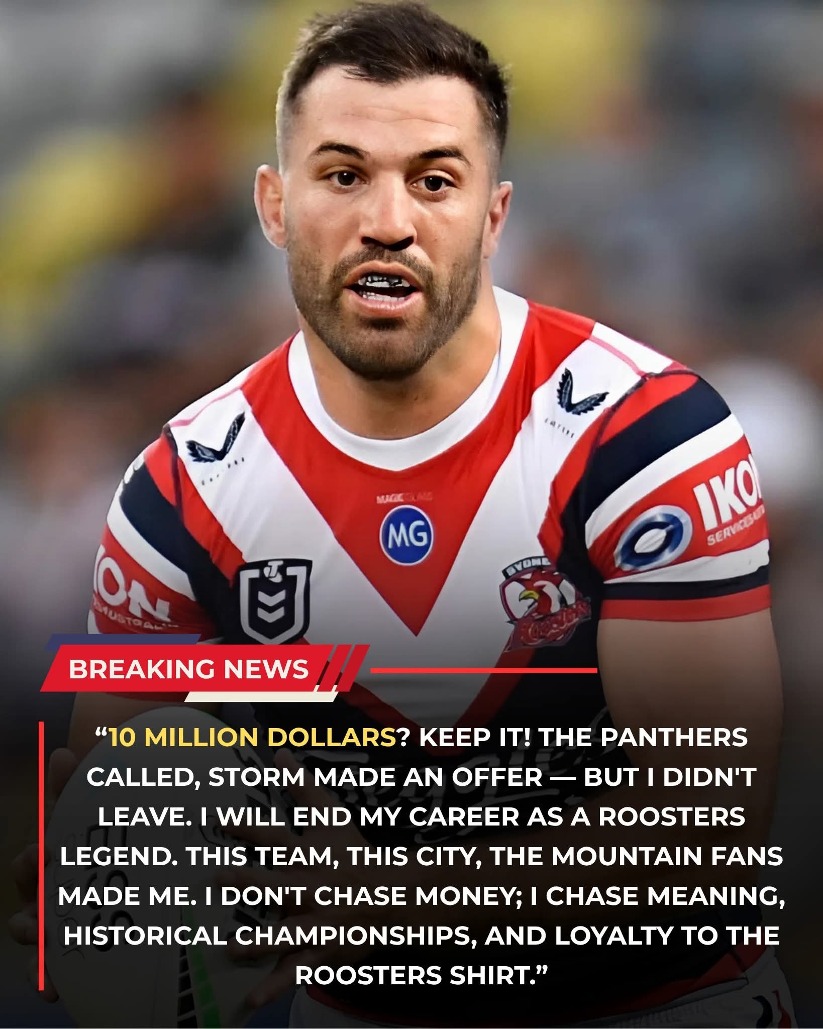 In a landscape often dominated by record-breaking contracts and the constant movement of star players, Sydney Roosters captain James Tedesco has delivered a powerful statement that has resonated throughout the rugby league world. Reports have emerged that the champion fullback has rejected a staggering $10 million offer from a rival suitor, choosing instead to remain a one-club man in the spirit of the game’s greatest icons.