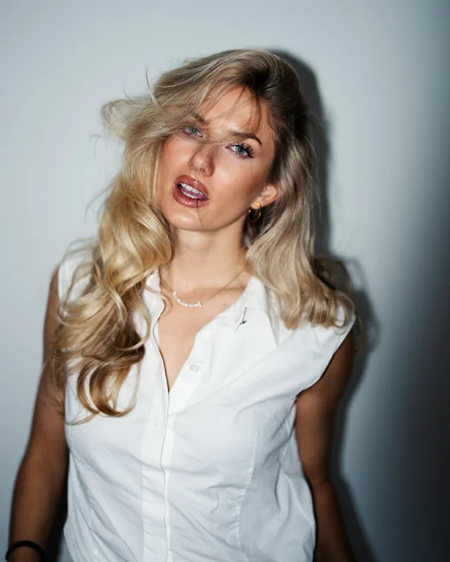 The focal point of the portraits was undoubtedly Schmidt’s hair, which moved away from her practical competition styles in favor of glamorous, voluminous waves. Styled with incredible bounce and a high-shine finish, her golden blonde curls were swept dramatically across her face, adding a sense of movement and “lived-in” luxury to the static frames. The soft texture of the curls provided a deliberate and striking contrast to the sharp lines of her collared shirt, highlighting the versatile beauty that has made her a favorite for international brand collaborations.