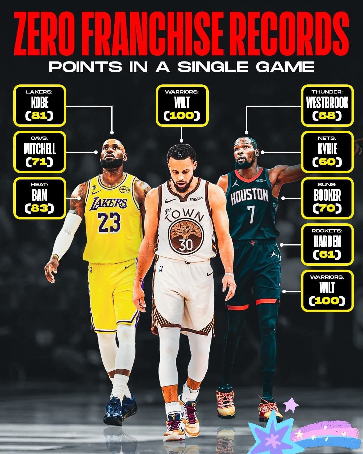 Other franchise record holders include Donovan Mitchell with 71 points for the Cleveland Cavaliers, Russell Westbrook scoring 58 for the Oklahoma City Thunder, Kyrie Irving dropping 60 for the Brooklyn Nets, Devin Booker scoring 70 for the Phoenix Suns, and James Harden with 61 points for the Houston Rockets.